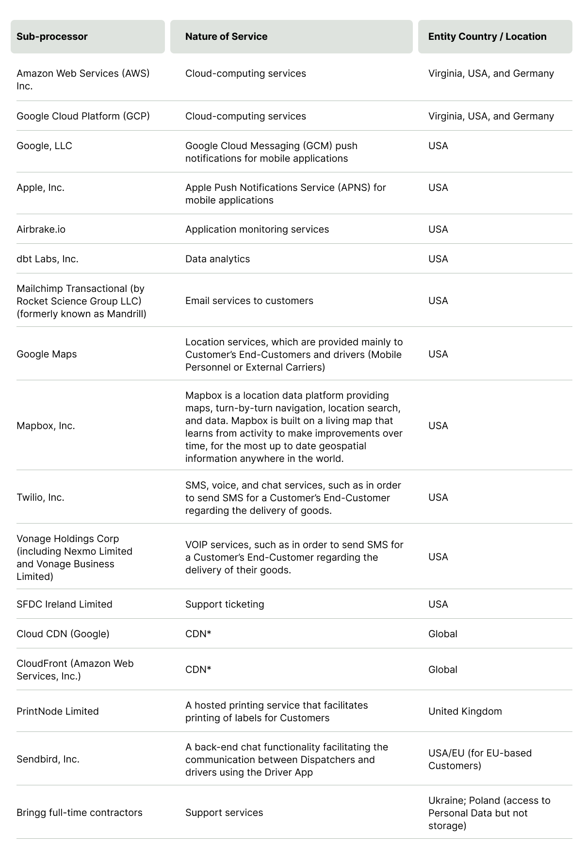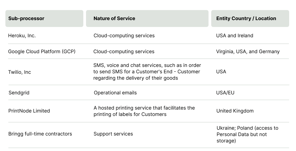 - Sub-Processors for Bringg Delivery Management Platform