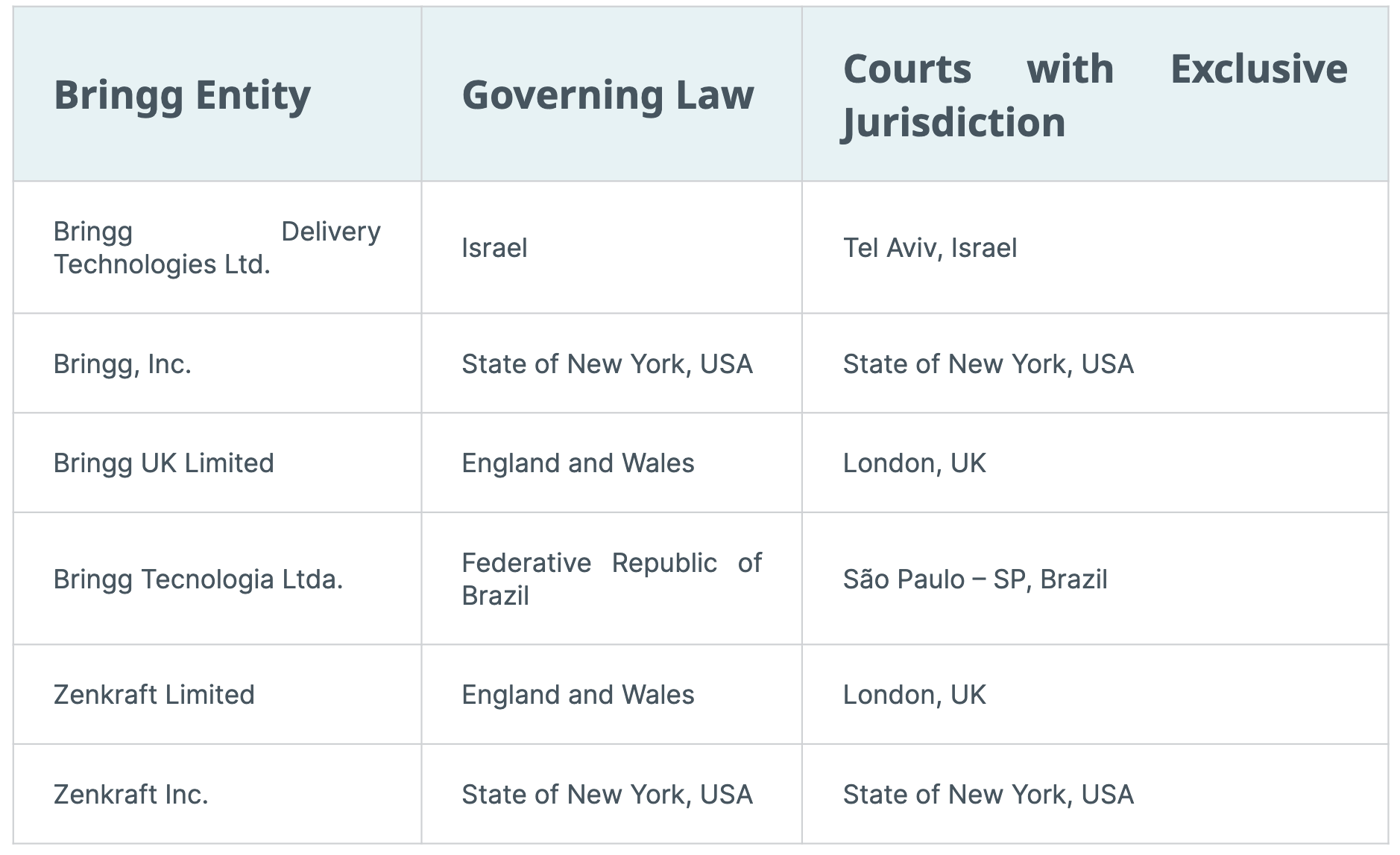 Governing Law and Jurisdiction. The laws that will apply in any dispute or lawsuit arising out of or in connection with this Agreement, regardless of its conflict of laws rules, and the location of the courts that have jurisdiction over any such dispute or lawsuit, depend on the Bringg entity entering into this Agreement, as set forth below: